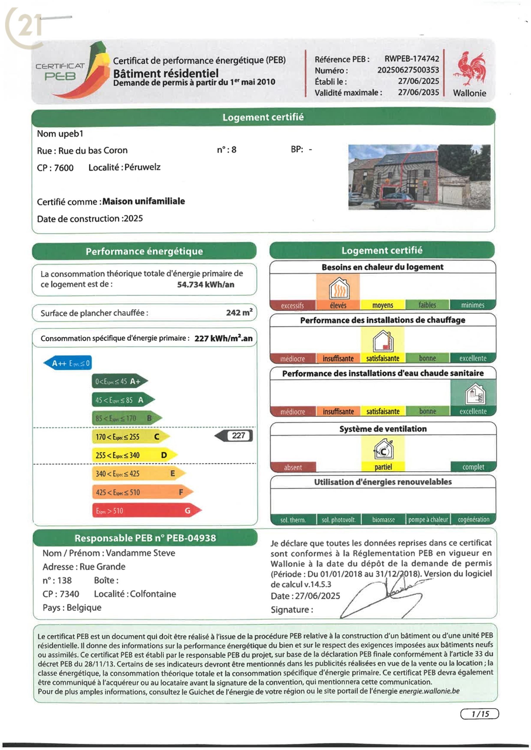 PEB C – 20250627500353 – 227 Kwh/m² pour la maison