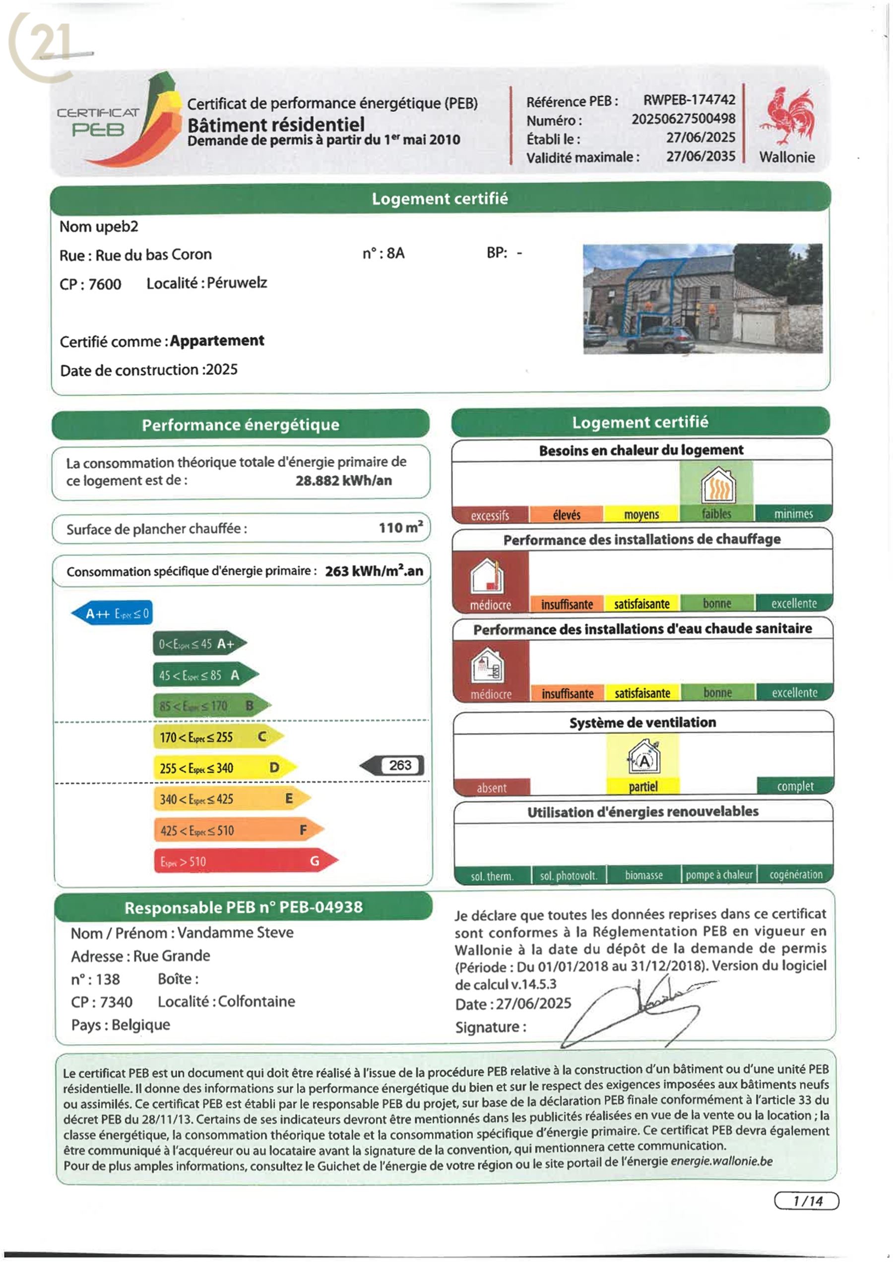 PEB D – 20250627500498 – 263 Kwh/m² pour le duplex
