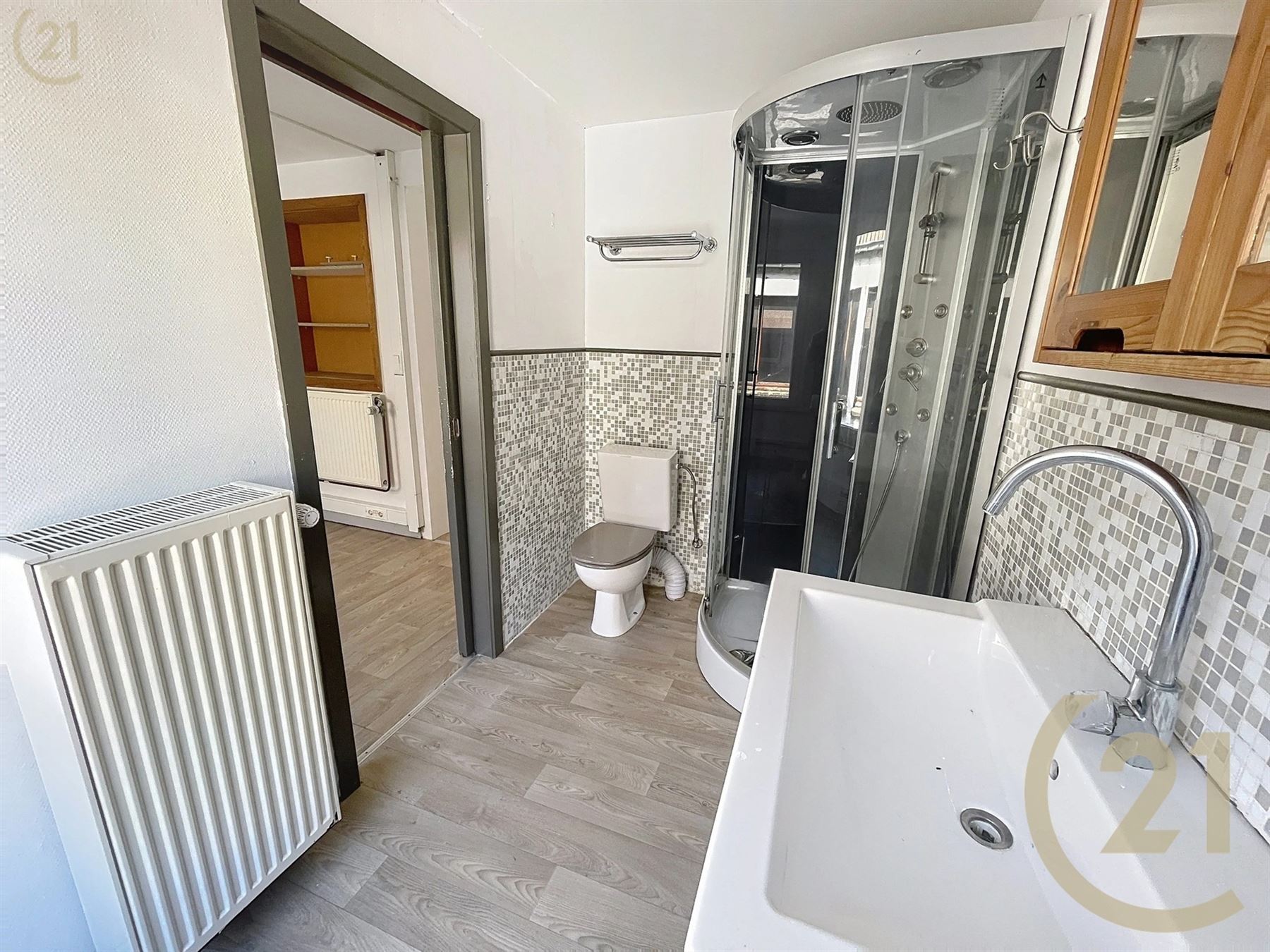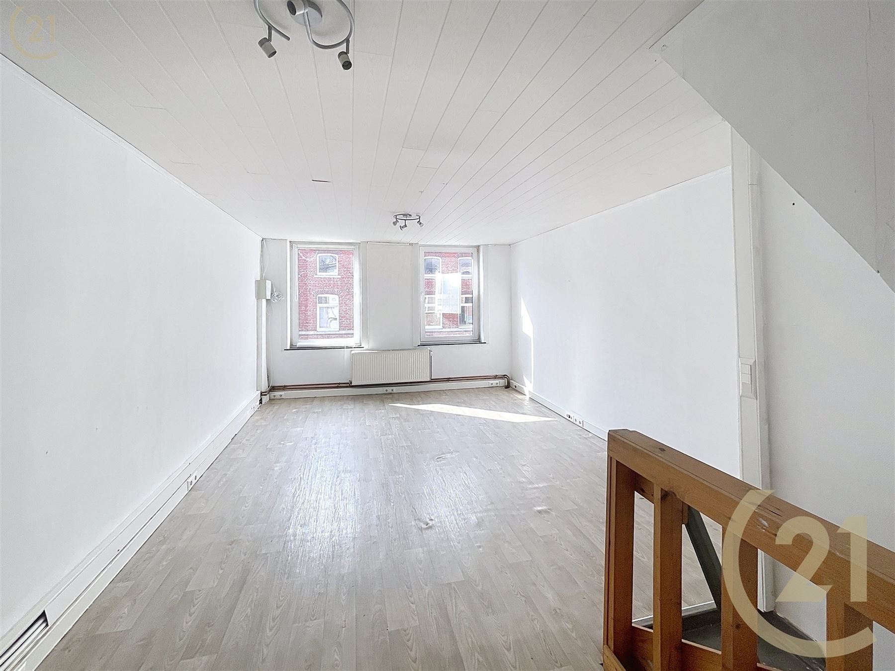 A l’étage: un appartement composé de deux chambres, une salle de douche et un grand grenier aménageable.
