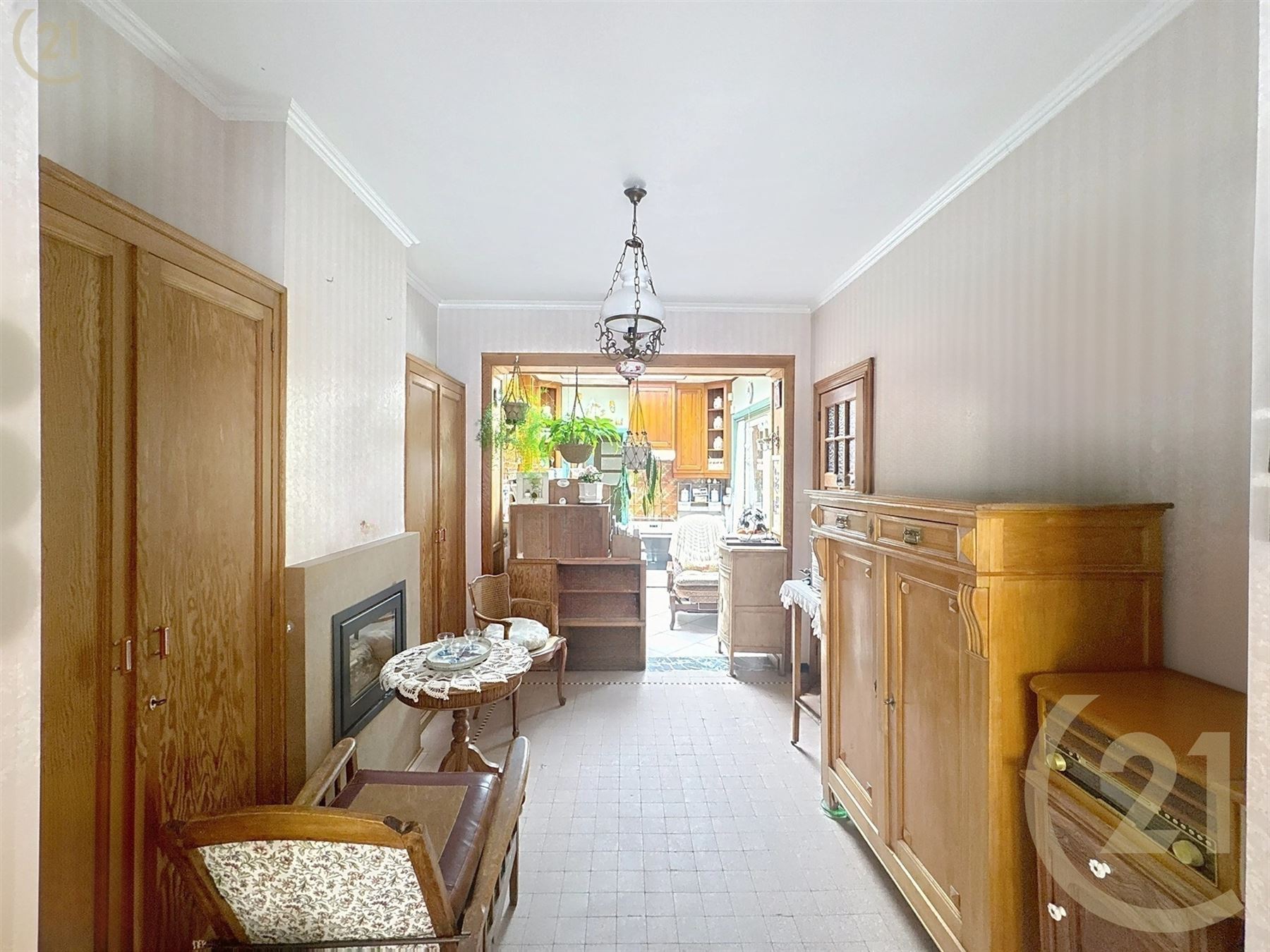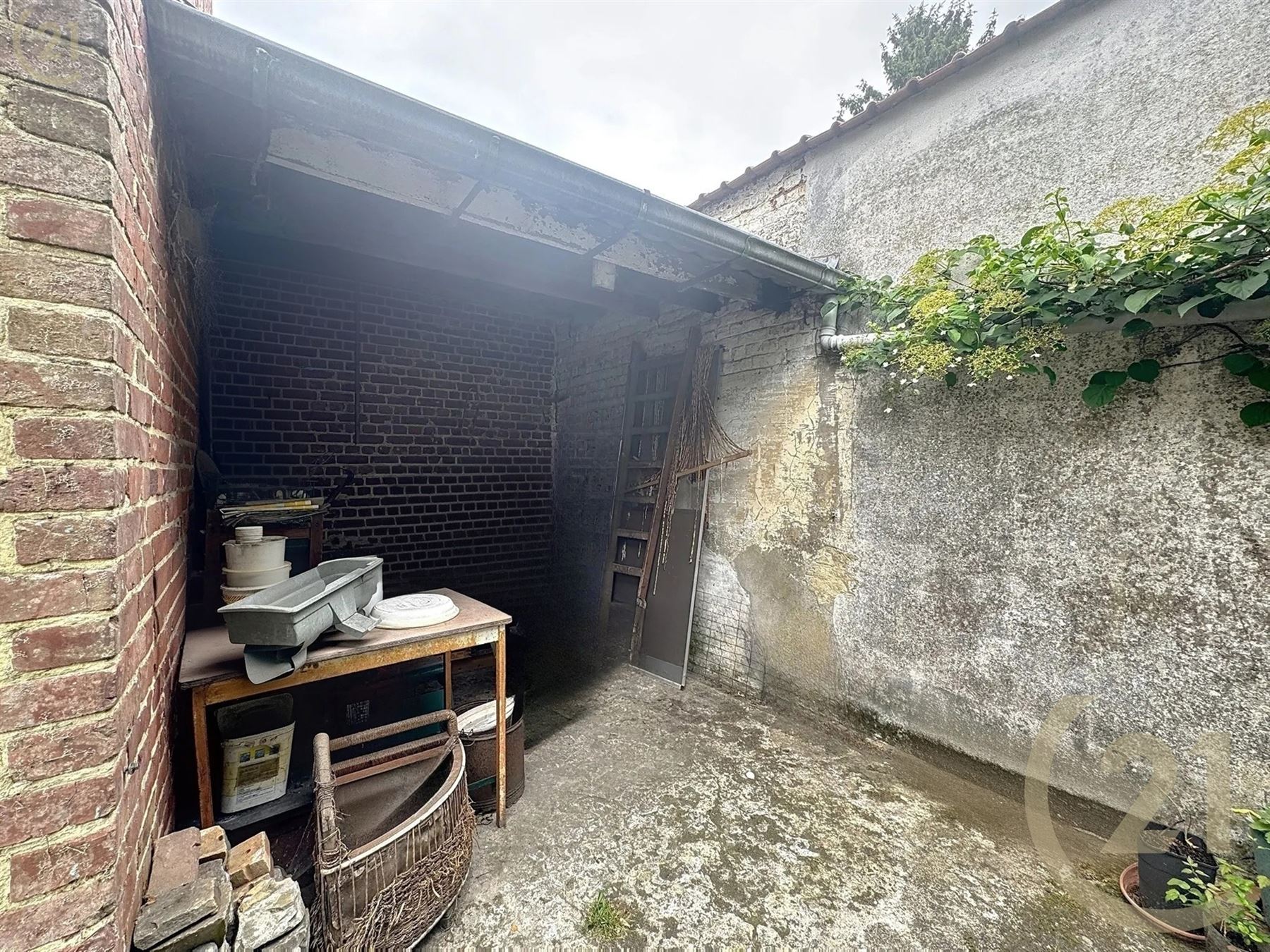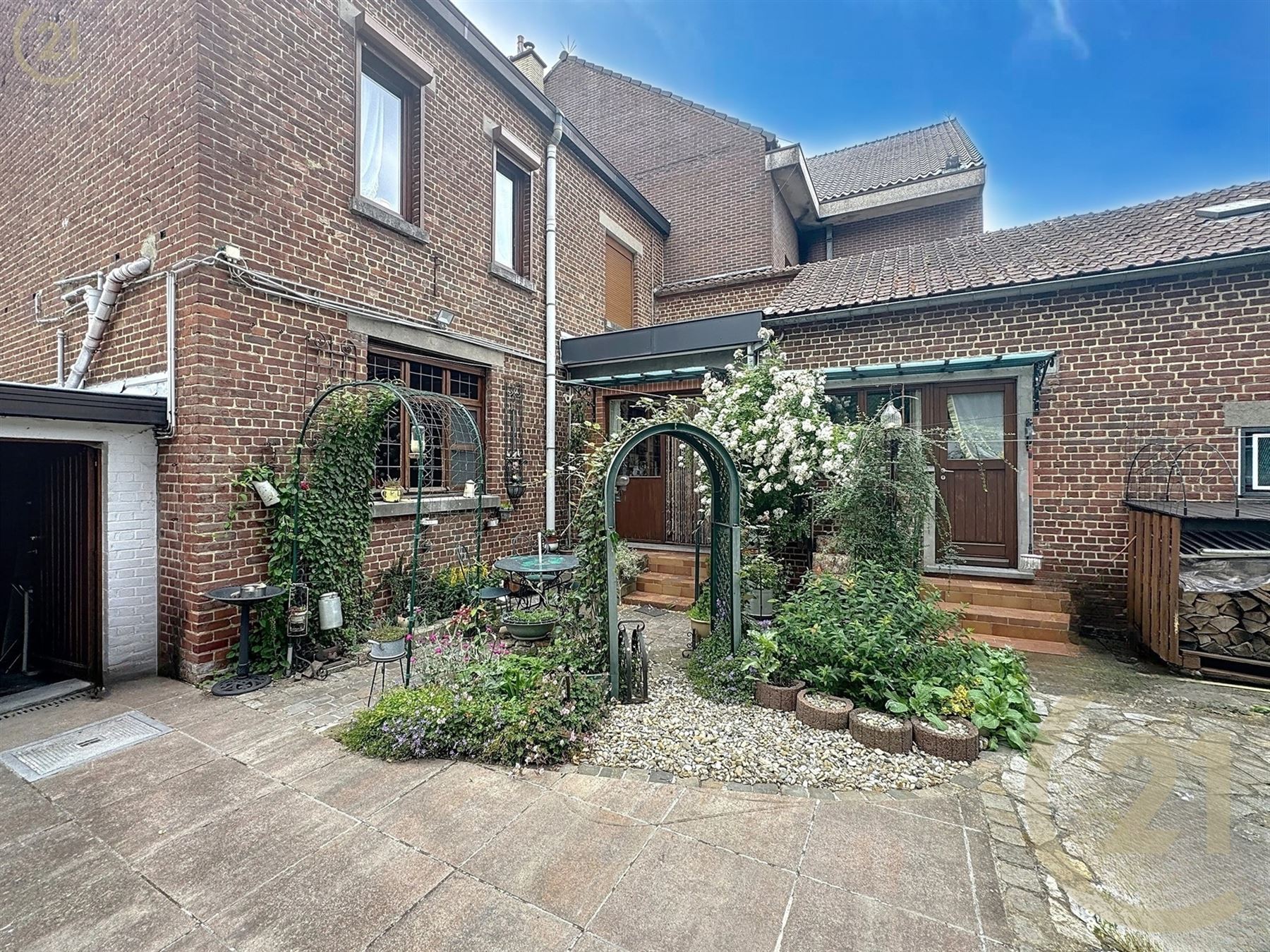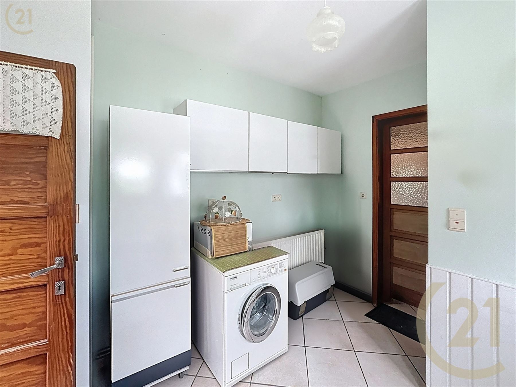 La maison se compose d’un hall d’entré, 1 chambre avec un parquet en chêne, un living ouvert sur la lumineuse cuisine, buanderie, atelier et 4 caves.