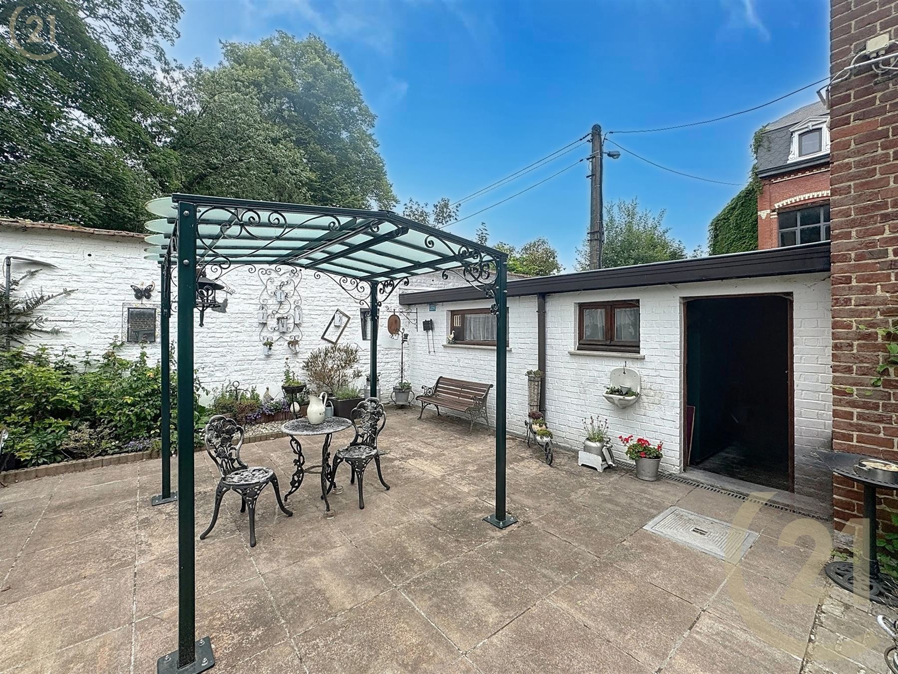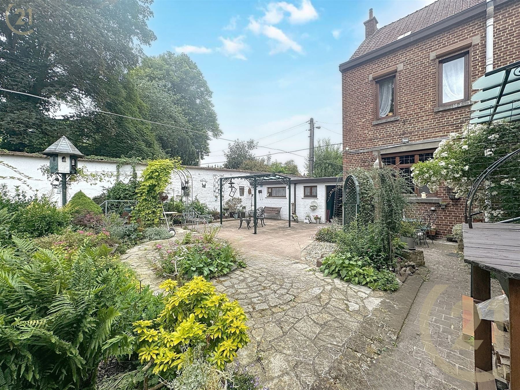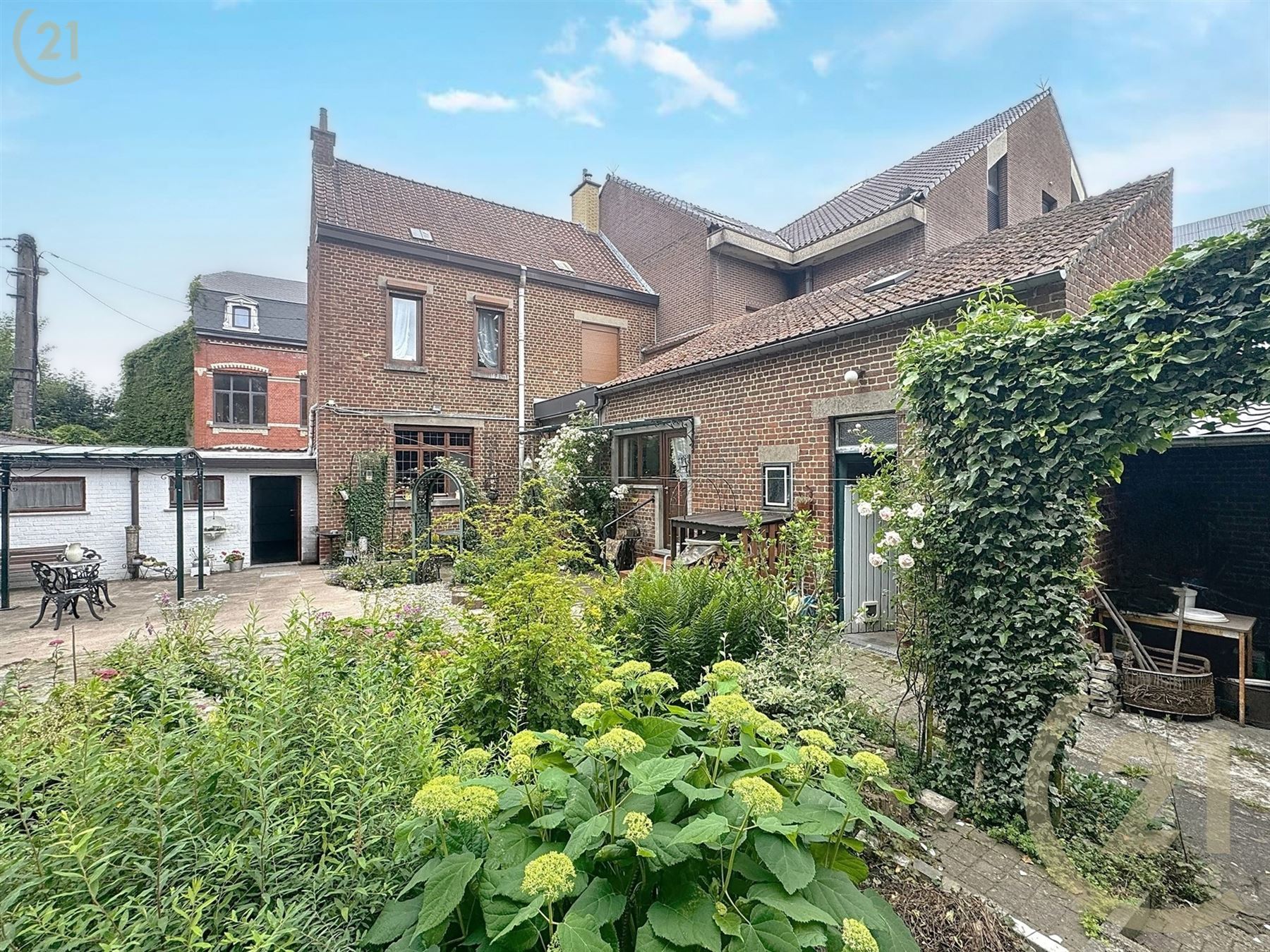 A l’extérieur : 2 garages avec passage vers le jardin, remise et jardin romantique.