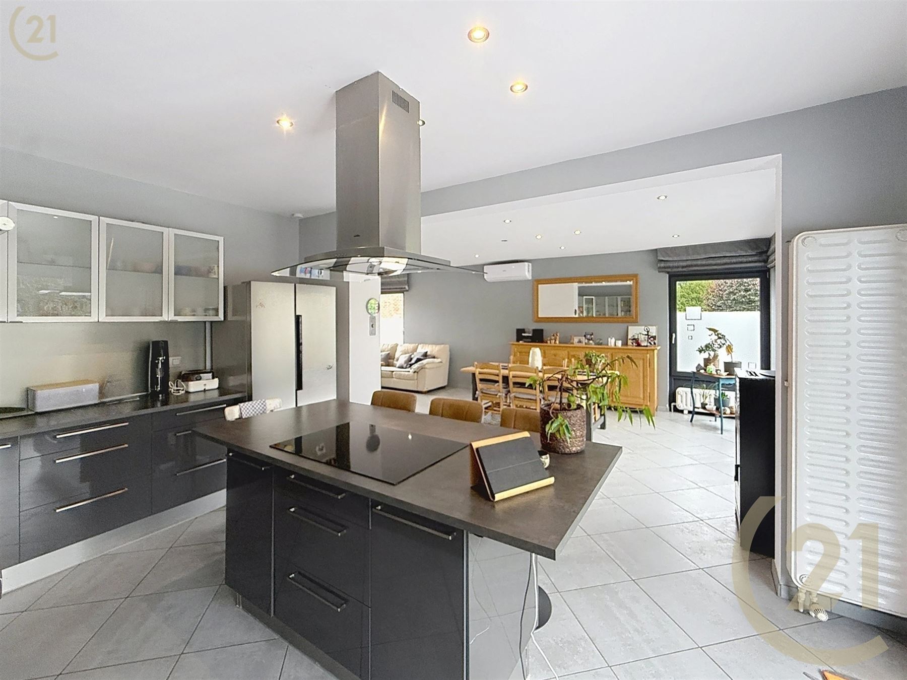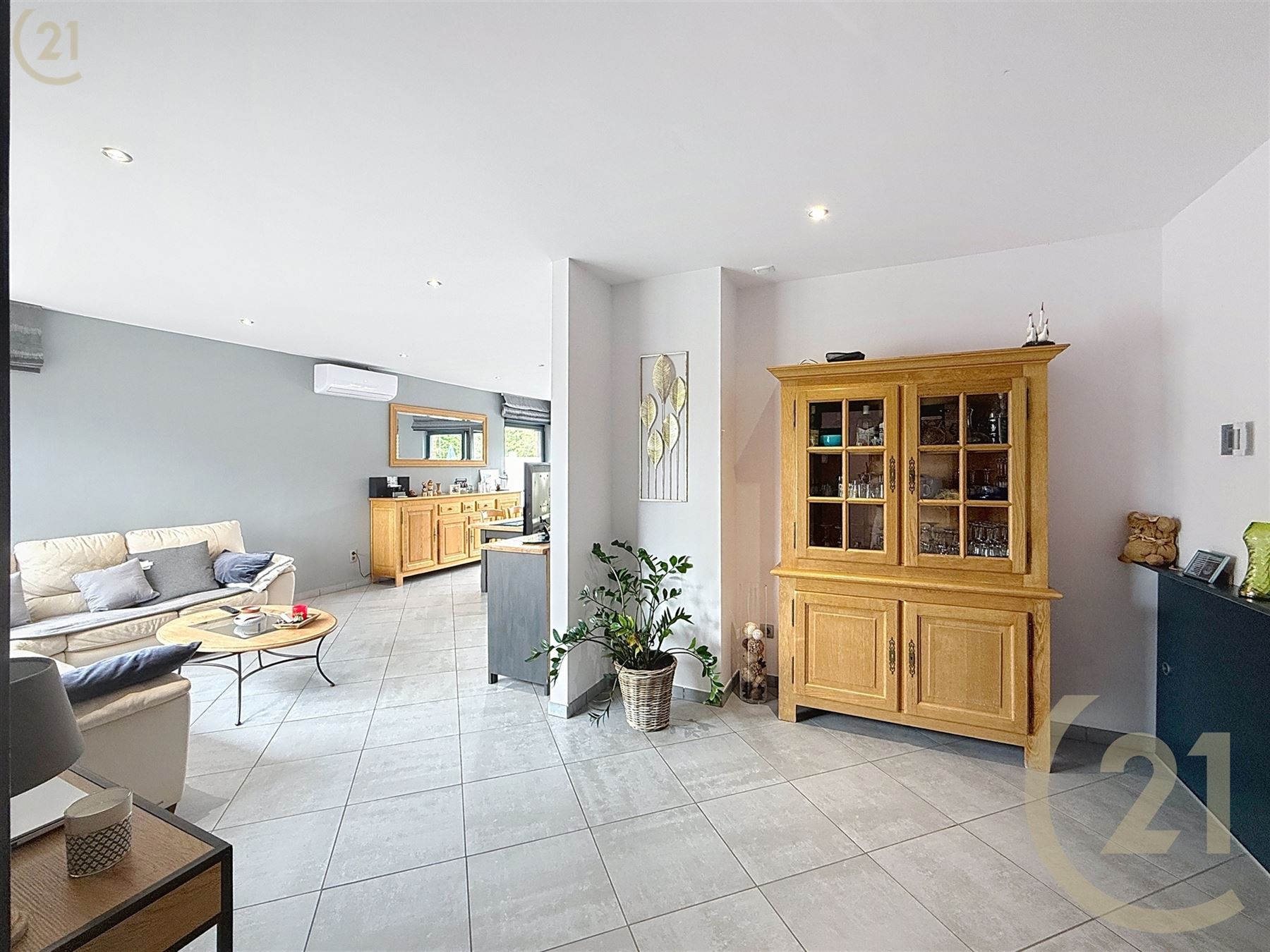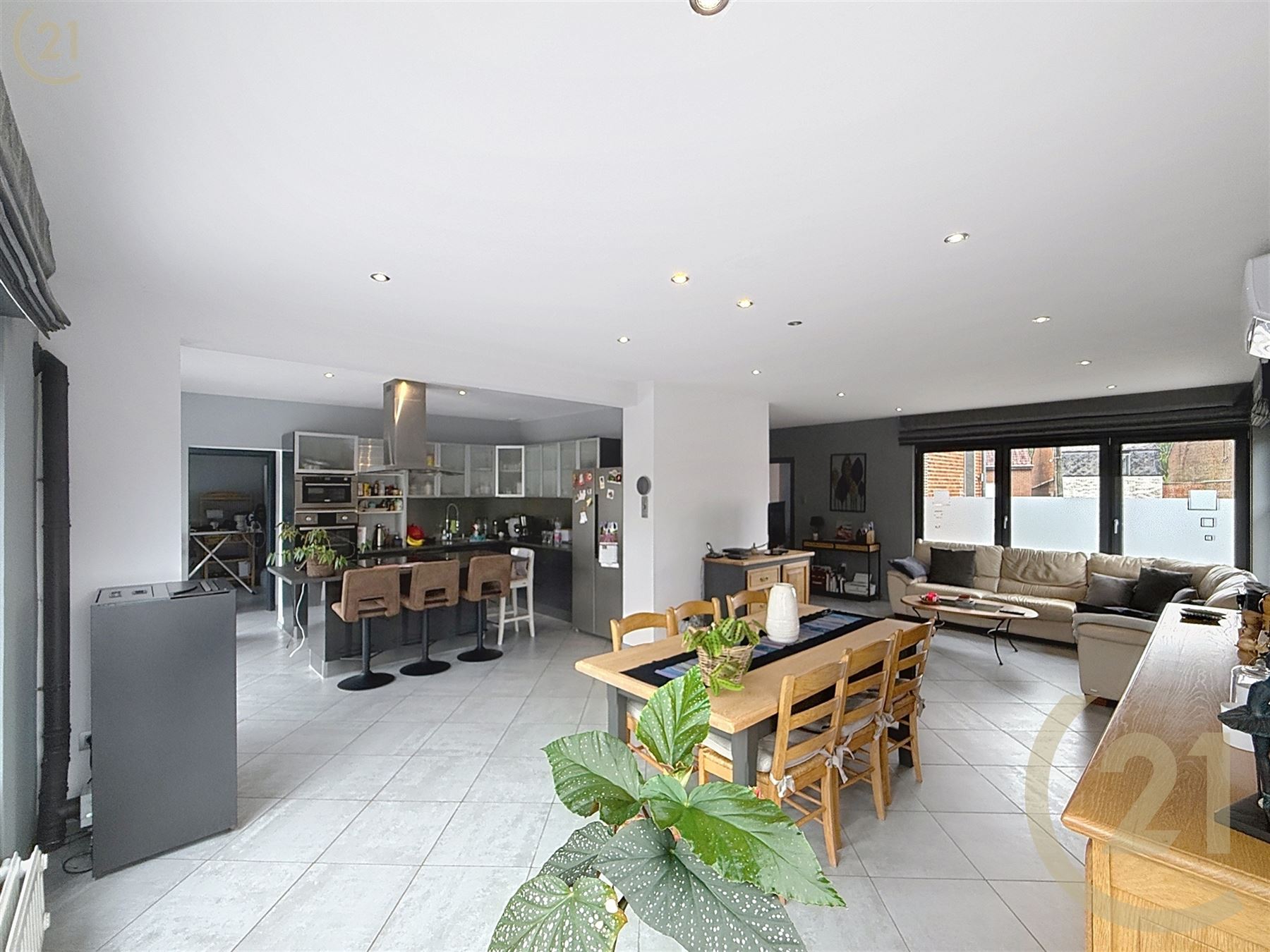 Hall d’entrée, salon, salle à manger avec cuisine ouverte et espace buanderie.