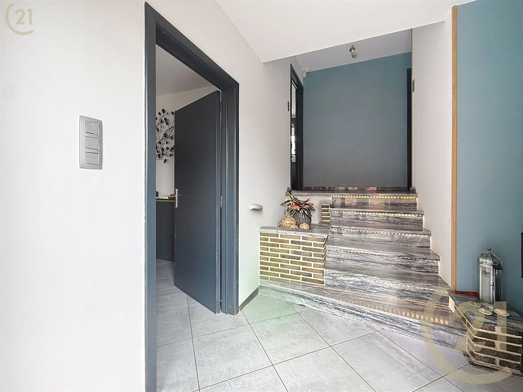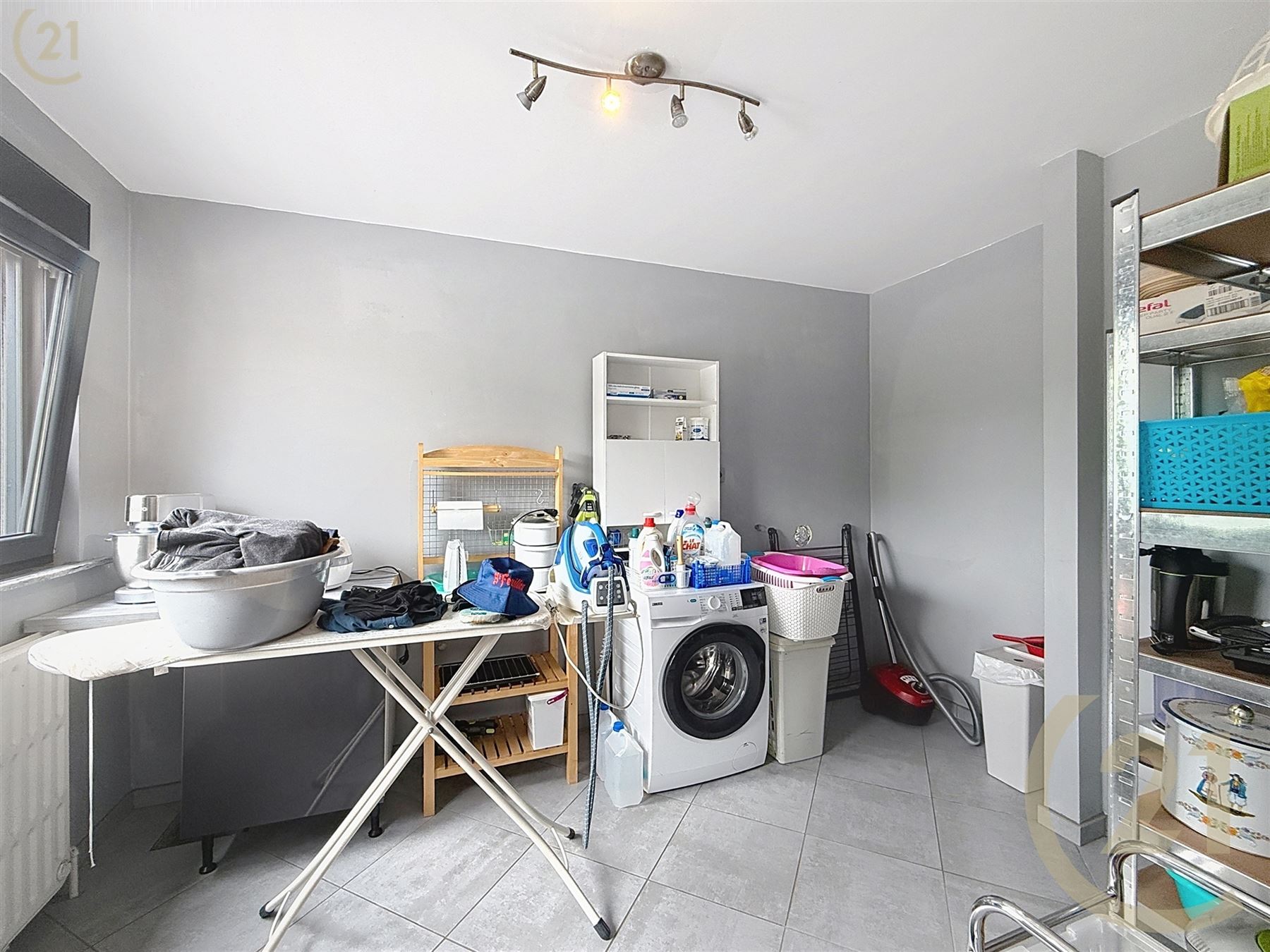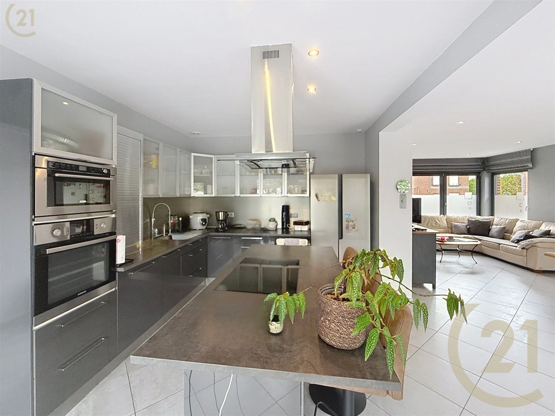 Hall d’entrée, salon, salle à manger avec cuisine ouverte et espace buanderie.