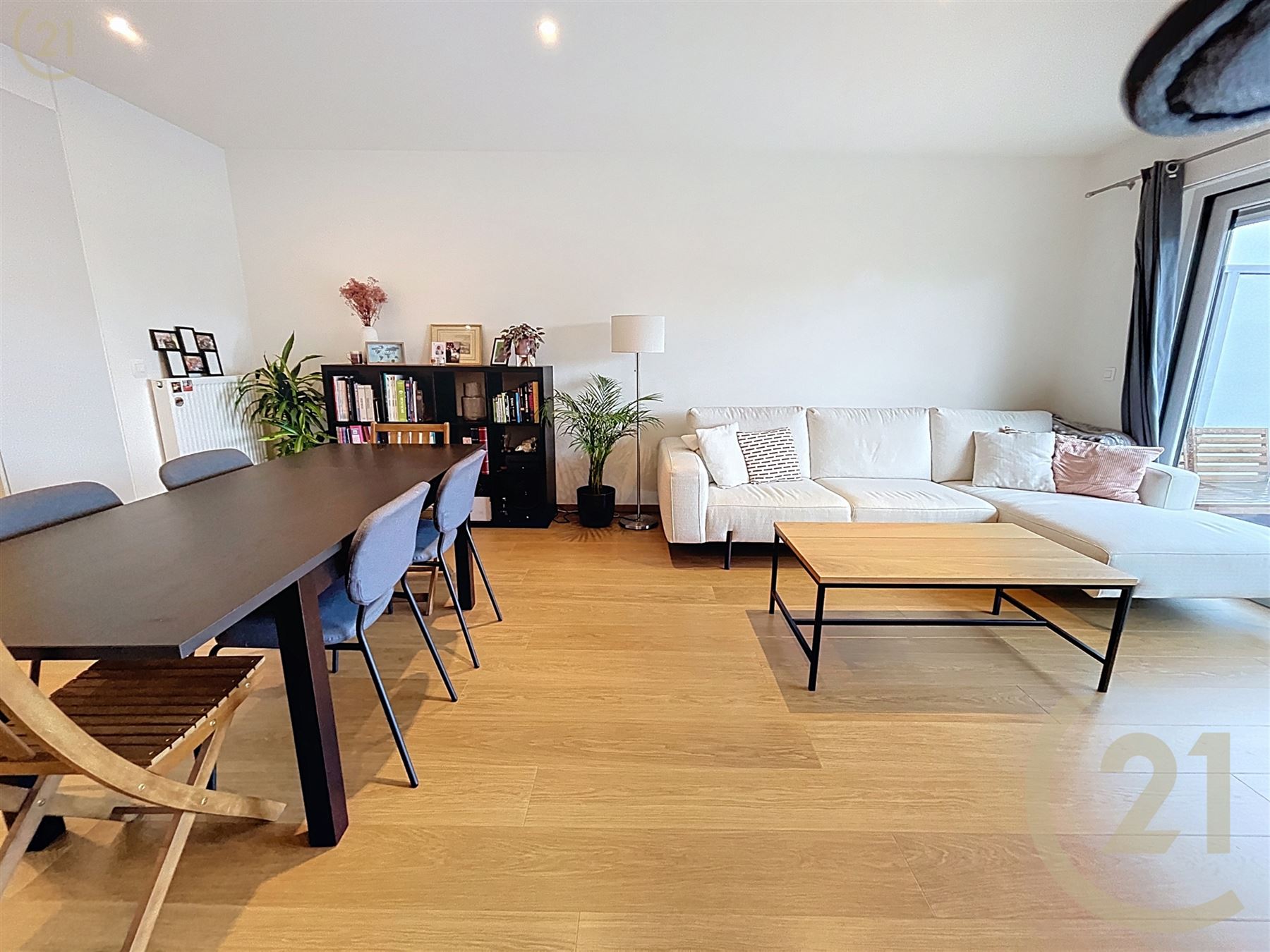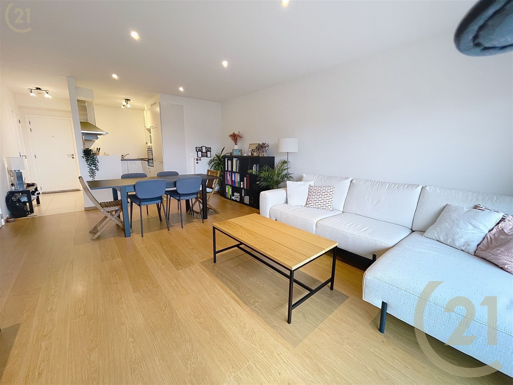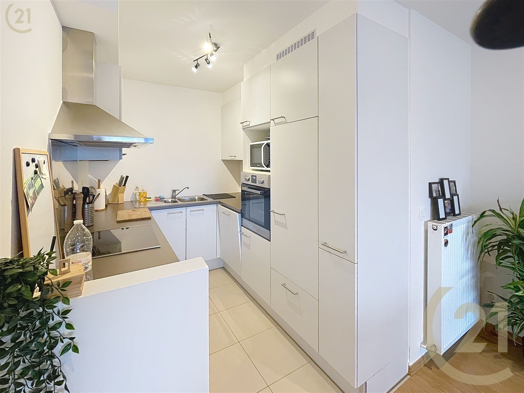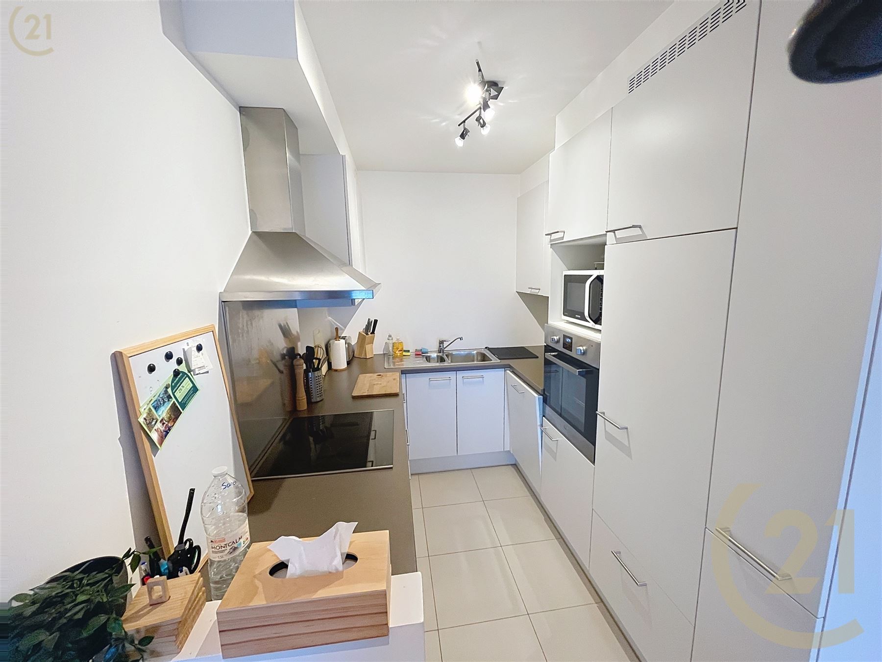 Living, cuisine équipée, salle de bain, un espace de rangement, une chambre, terrasse et garage privatif.